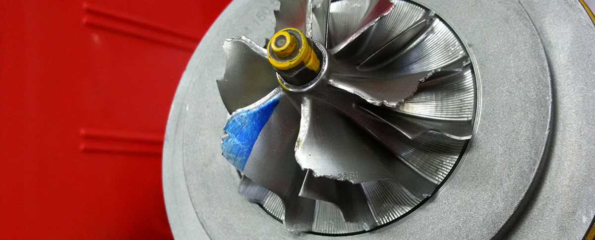 До оштетување на турбо - компресорот доаѓа поради влез на надворешно тело во зоната на ротација на турбинското коло. Надворешно тело може да влезе преку блокот на моторот (дел од вентил, куќиште на грејач или водилки), но исто така, истиот дефект може да биде предизвикан и од оштетувања на внатрешните ѕидови на издувната грана. Оштетувањето на роторот на турбината доведува до дебаланс на роторот на турбо - компресорот, а со самото тоа и до абење на лежиштата и заптивните карики на турбо - компресорот, па оттаму доаѓа и до појава на потрошувачка на масло, моторот нема снага и се појавува бел или син чад од ауспухот.